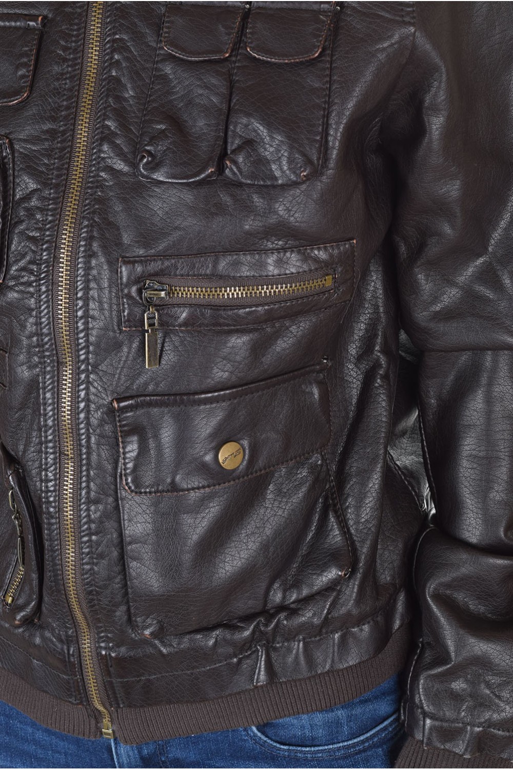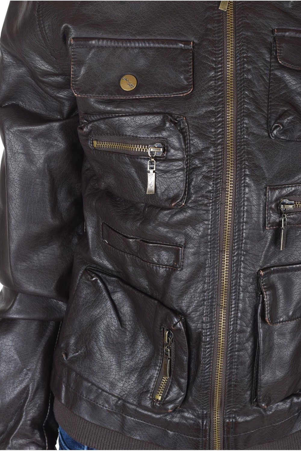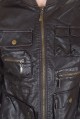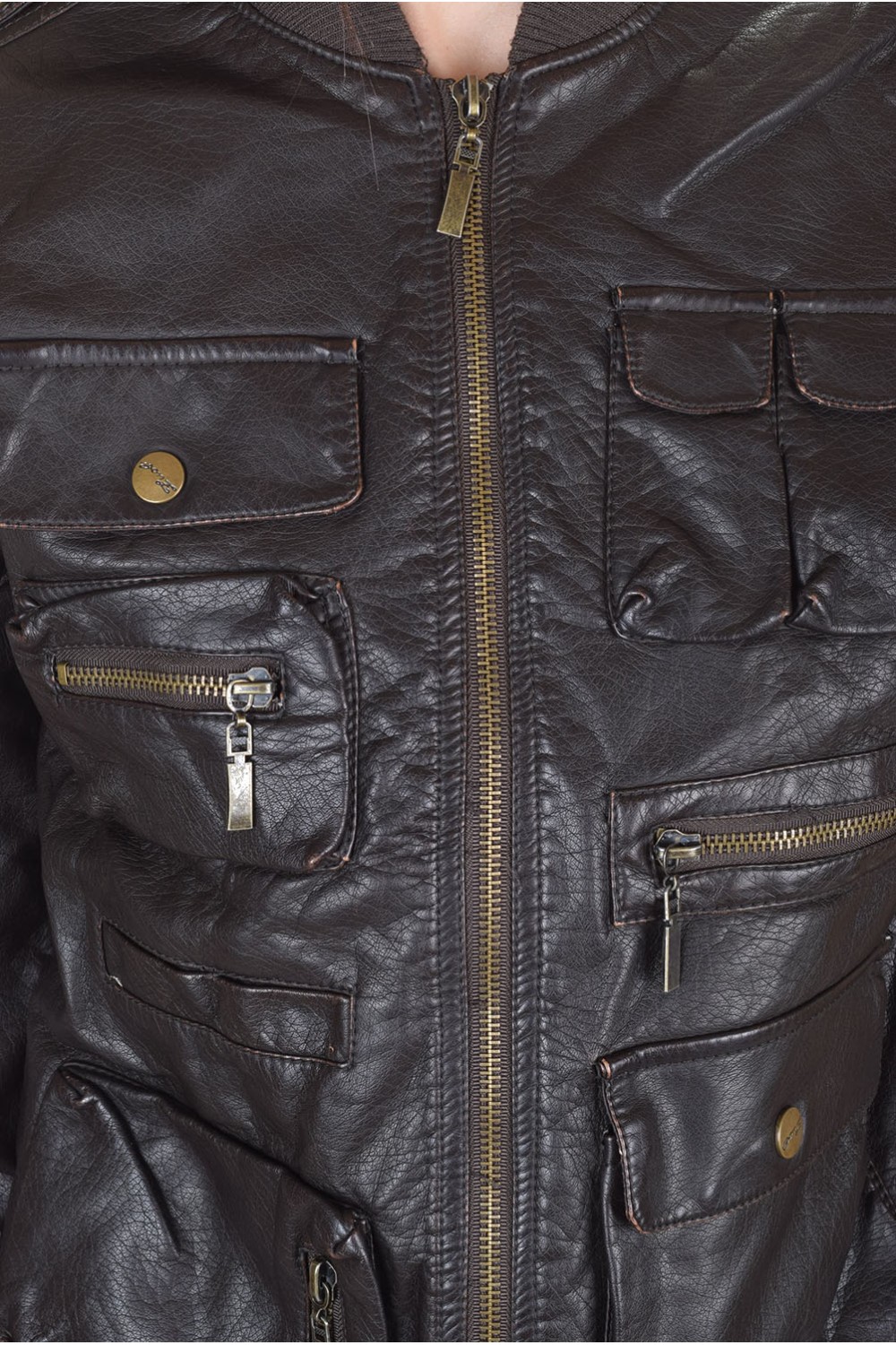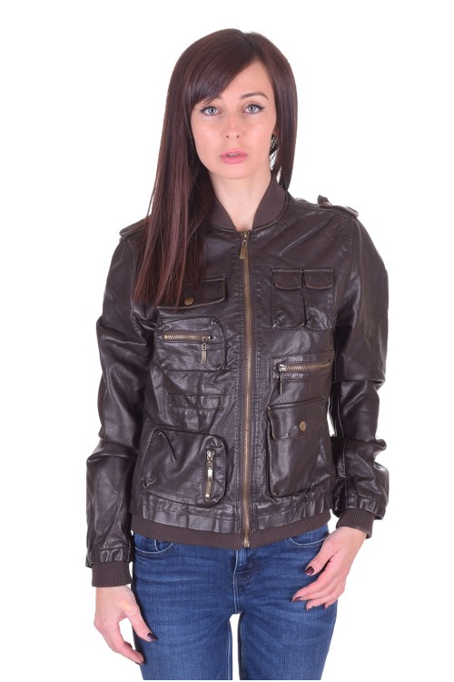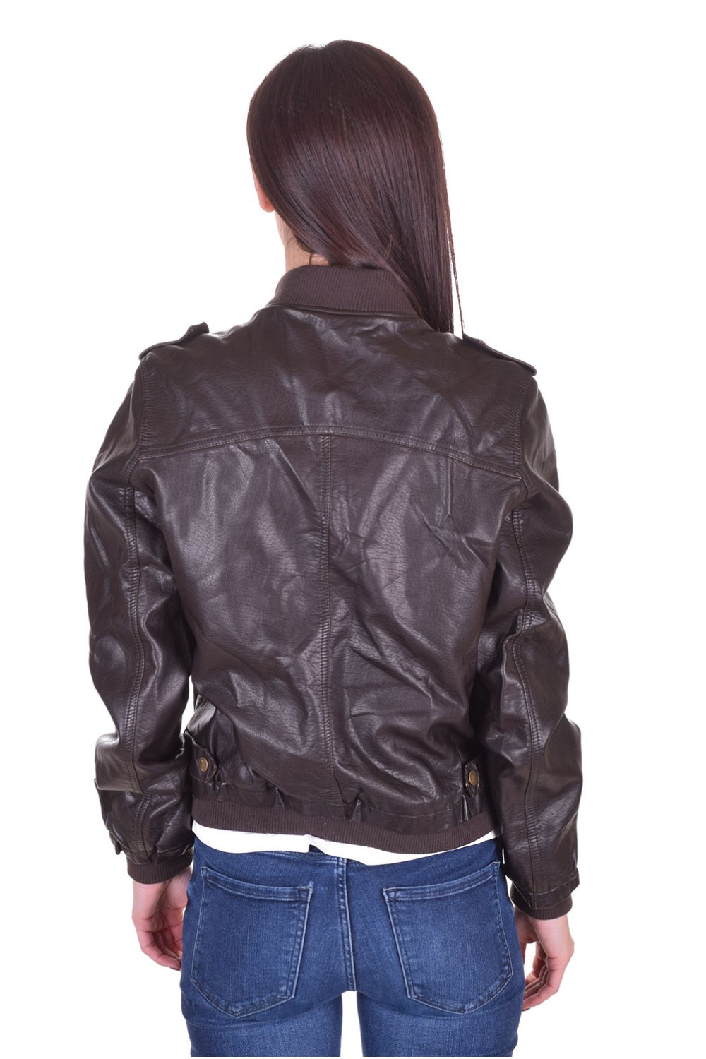 Γυναικείο μπουφάν από δερματίνη με μέση, μανίκια και γιακά από βαμβάκι και μεταλλικό φερμουάρ. Περιφέρεια στήθους: 96 εκ. Μήκος: 61 εκ. Μέση: 88 εκ. Περιφέρεια γοφών; 82 εκ. Το μοντέλο είναι ψηλό 170 εκ.