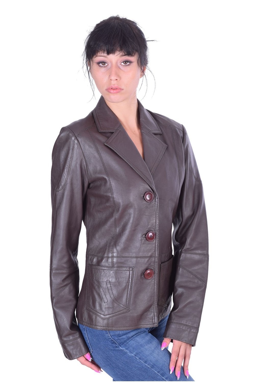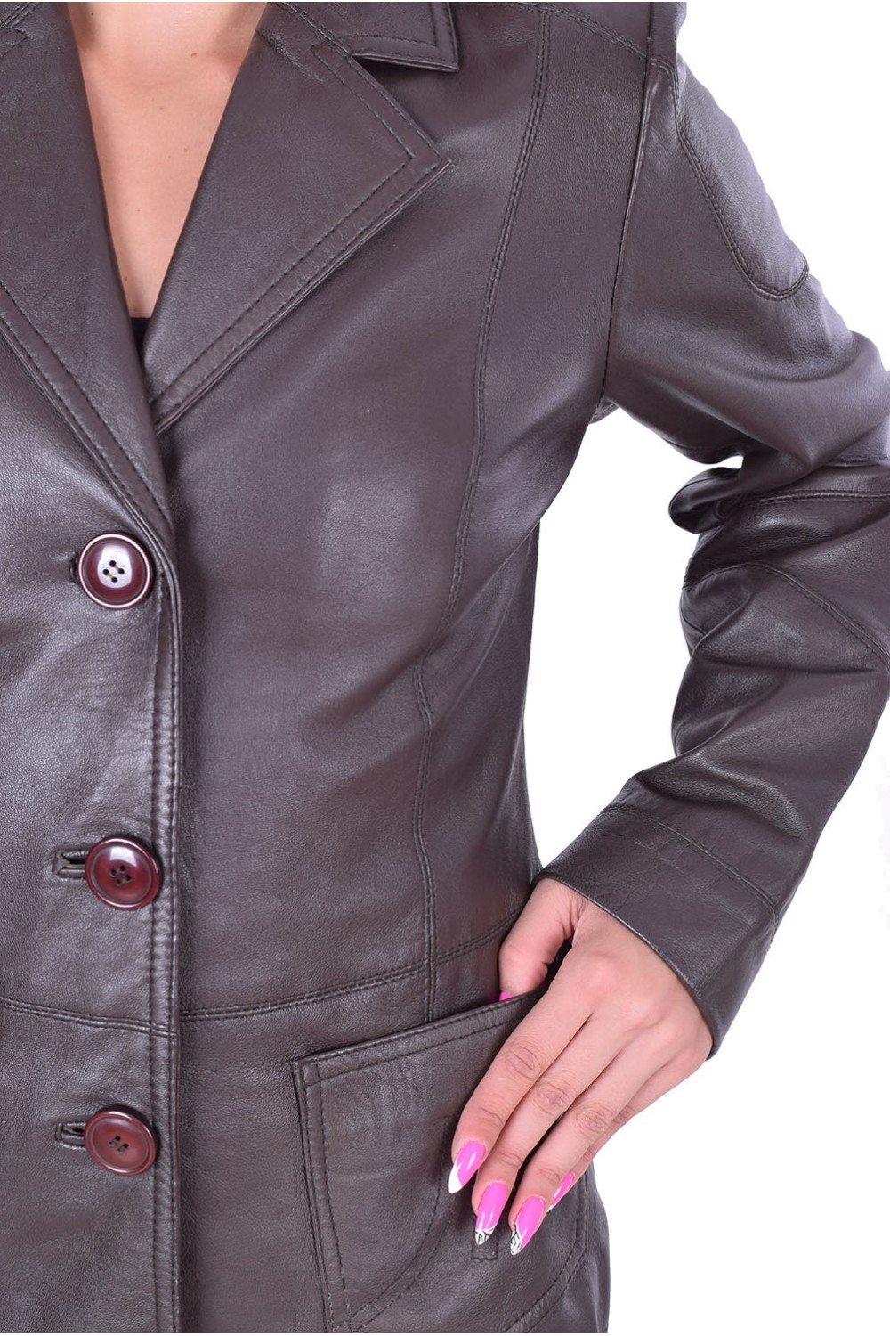 Σκούρο καφέ γυναικείο μπουφάν από μαλακό δέρμα με δύο μπροστινές τσέπες, καφέ κουμπιά και φόδρα από πολυεστέρα. Περιφέρεια στήθους: 92 εκ. Μήκος: 65 εκ. Μέση: 80 εκ. Περιφέρεια γοφών; 88 εκ. Το μοντέλο είναι ψηλό 170 εκ.